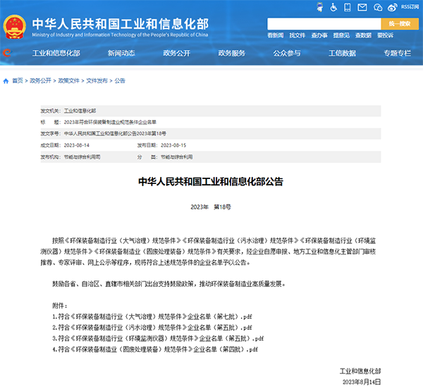 為貫徹落實《環保裝備制造業高質量發展行動計劃(2022-2025年)》,引導環保裝備制造業高質量發展,促進行業技術創新,提升綠色發展水平,近日,國家工業和信息化部公示“2023年符合環保裝備制造業規范條件企業名單”,在大氣治理、污水治理、環境監測、固廢處理等領域,全國總計59家企業入選。