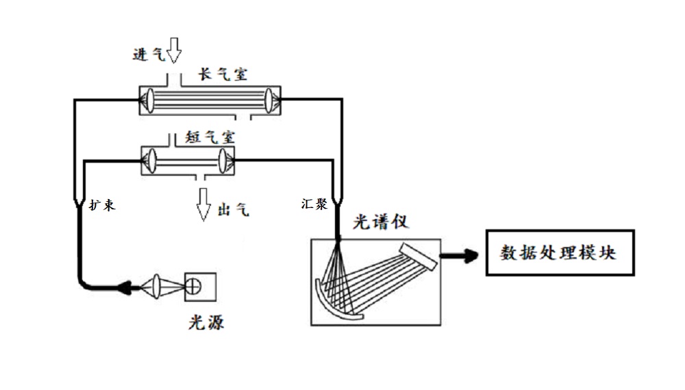 紅外光學傳感部分由紅外光源、長光室、短光室、紅外光譜儀等光學組件構成,光源發(fā)出的紅外光由擴束器分光進入兩個氣室,光分別穿透氣室后由匯聚器收光一起進入紅外光譜儀進行探測。最后將數據送入數據模塊進行分析,可以得出氣體中相關組分的濃度。